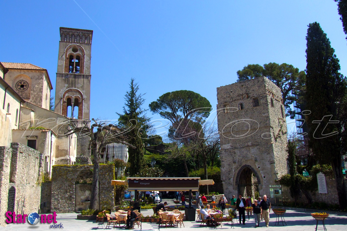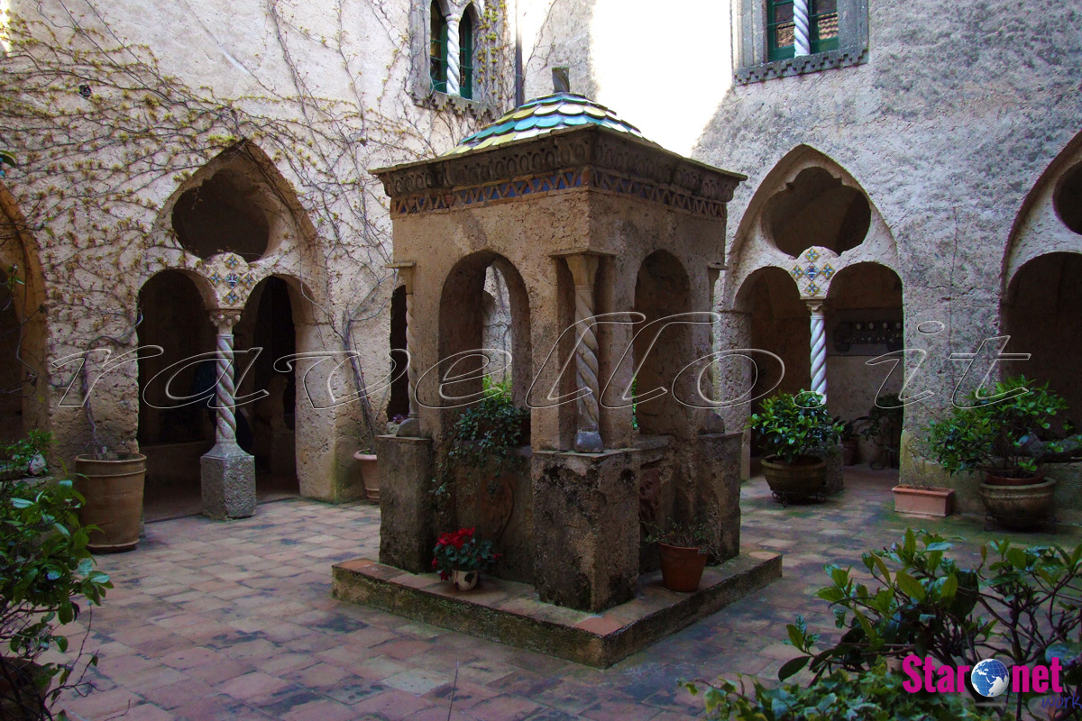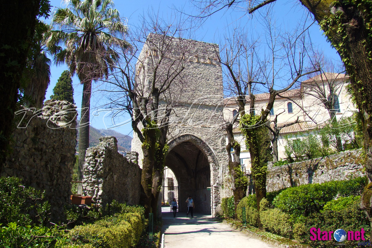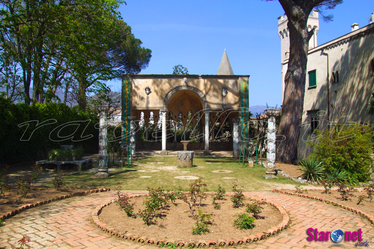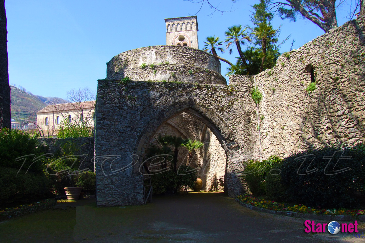 Villa Rufolo, construida en la segunda mitad del siglo XII, con sus dos torres de estilo árabe-normando. Desde el vestíbulo de la torre de entrada, decorado con arcos entrelazados en las paredes y la bóveda y con cuatro grandes estatuas que simbolizan la Caridad y la Hospitalidad, valores practicados asiduamente por la familia Rufolo, se llega al edificio de tres pisos a través de una avenida arbolada. . A la izquierda está la torre principal, la 'Torre Maggiore', de casi 30 m de altura, y a la derecha está el patio cuadrado, similar a un pequeño claustro. A través de un encantador bulevar, se llega a la terraza de Richard Wagner, llamada así porque aquí, el 26 de mayo de 1880, la "música de luces y colores" inspiró la imaginación de los músicos: la visión del jardín escénico de Klingsor, el jardín mágico de Klingsor en el segundo acto de su obra maestra "Parsifal". Los jardines de Villa Rufolo y las impresionantes vistas son el fondo del importante Festival Anual Internacional de Música Ravello que se celebra todos los veranos: el Festival Wagner. El jardín rico de flores de colores y maravillosas cuenta con un claustro morisco. El Antiquarium ubicado en la antigua capilla del complejo recoge reliquias y fragmentos recuperados en la segunda mitad del siglo XIX.