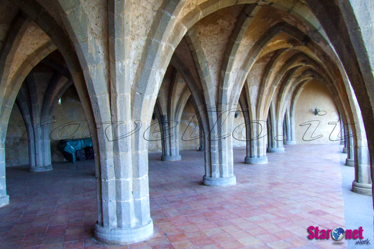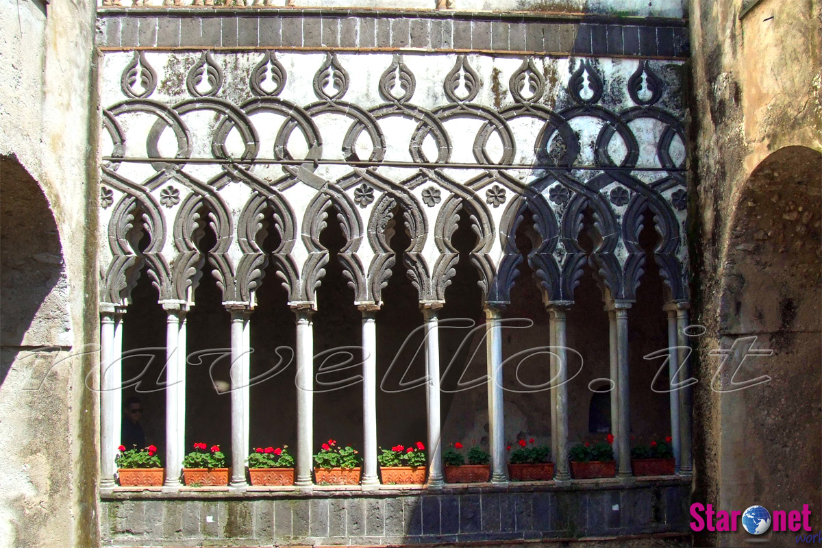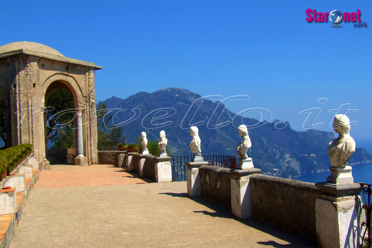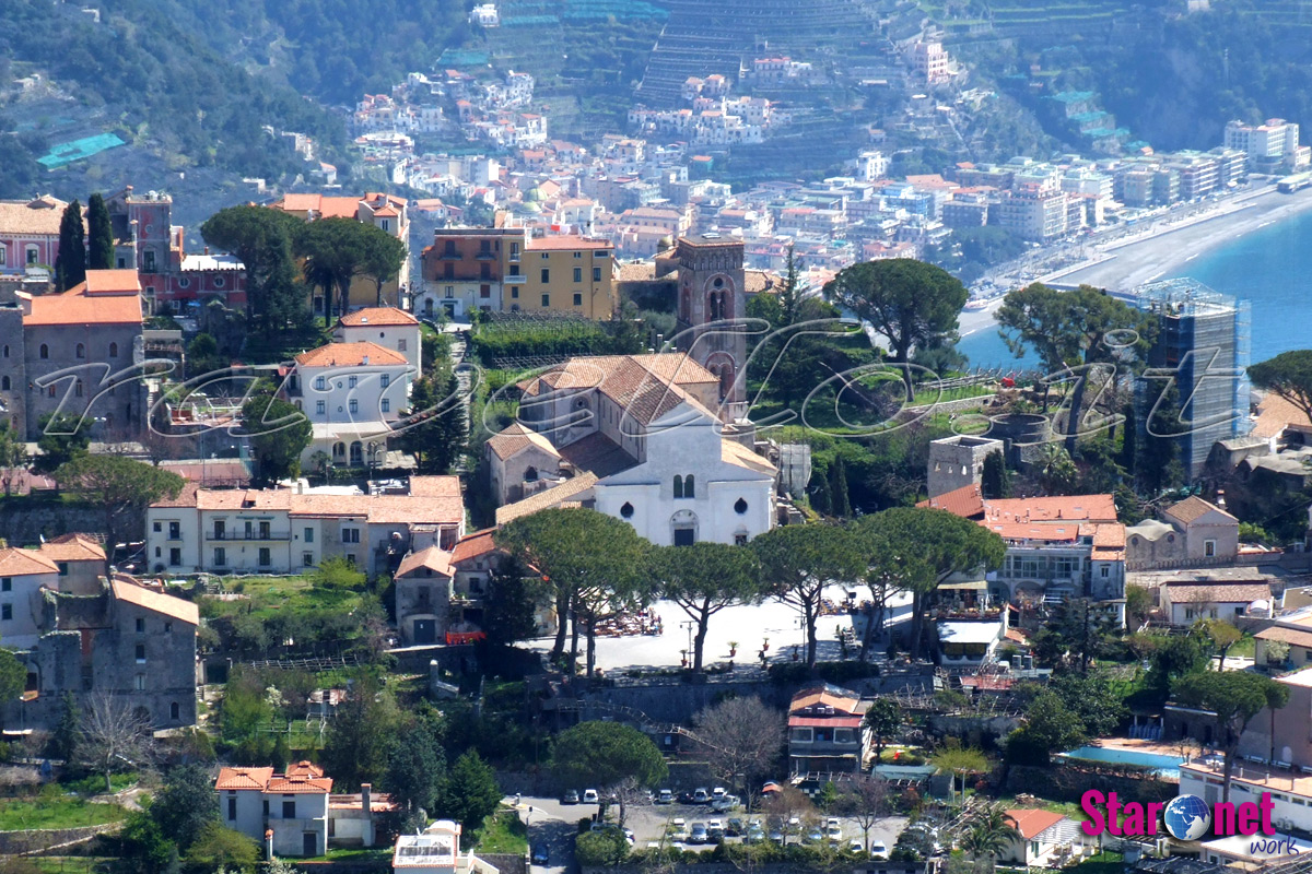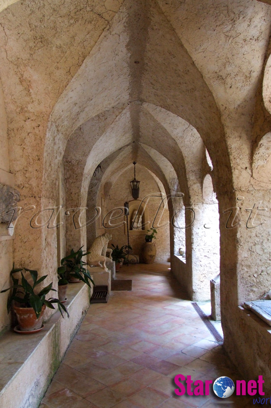 Villa Rufolo, construida en la segunda mitad del siglo XII, con sus dos torres de estilo árabe-normando. Desde el vestíbulo de la torre de entrada, decorado con arcos entrelazados en las paredes y la bóveda y con cuatro grandes estatuas que simbolizan la Caridad y la Hospitalidad, valores practicados asiduamente por la familia Rufolo, se llega al edificio de tres pisos a través de una avenida arbolada. . A la izquierda está la torre principal, la 'Torre Maggiore', de casi 30 m de altura, y a la derecha está el patio cuadrado, similar a un pequeño claustro. A través de un encantador bulevar, se llega a la terraza de Richard Wagner, llamada así porque aquí, el 26 de mayo de 1880, la "música de luces y colores" inspiró la imaginación de los músicos: la visión del jardín escénico de Klingsor, el jardín mágico de Klingsor en el segundo acto de su obra maestra "Parsifal". Los jardines de Villa Rufolo y las impresionantes vistas son el fondo del importante Festival Anual Internacional de Música Ravello que se celebra todos los veranos: el Festival Wagner. El jardín rico de flores de colores y maravillosas cuenta con un claustro morisco. El Antiquarium ubicado en la antigua capilla del complejo recoge reliquias y fragmentos recuperados en la segunda mitad del siglo XIX.